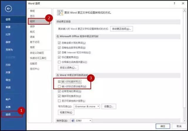 【文件】-【選項】-【校對】,取消勾選“鍵入時檢查拼寫”和“鍵入時標(biāo)記語法錯誤”。