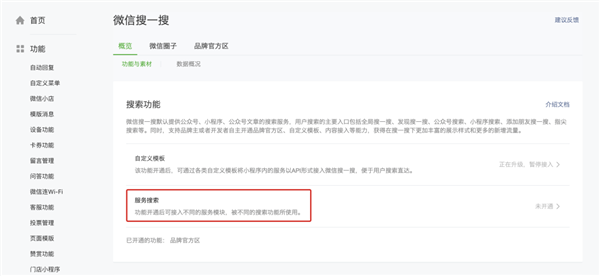 商家登錄微信公眾平臺(tái),在“微信搜一搜”-“搜索功能”中點(diǎn)擊“服務(wù)搜索”,進(jìn)入服務(wù)搜索頁。