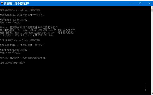 在管理員命令提示符窗口中輸入 sfc /SCANNOW 命令,按下鍵盤上的回車鍵,待其運行完成,顯示資源保護未找到任何完整性沖突即可。