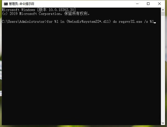 在管理員:命令提示符窗口中輸入:“for %1 in (%windir%system32*.dll) do regsvr32.exe /s %1”,并回車鍵確定。