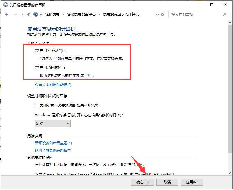 5、在聆聽文本朗讀的窗口下取消“啟用講述人”與“啟用音頻描述”的勾選,點擊確定即可。(注意:如果你的桌面快捷圖標有藍框,那么“啟用講述人”和“啟用音頻描述”一定是勾選狀態,所以去掉勾選點擊應用--確定即可解決此問題。)