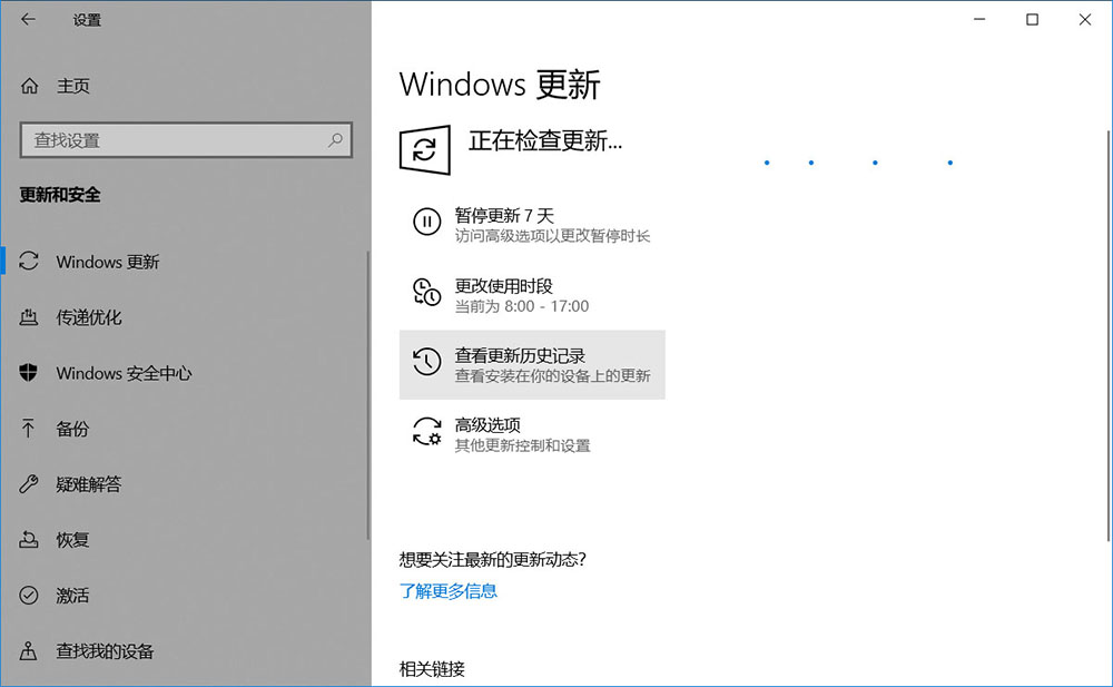 進入 設置 - Windows 設置 - 更新和安全 - Windows 更新,點擊:檢查更新 - 正在檢查更新;
