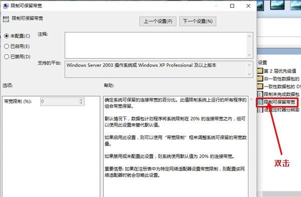 3、雙擊右側(cè)“限制可保留寬帶”彈出對話框,可以看到默認(rèn)設(shè)置為未配置,下面的說明顯示:如果禁用或未配置此設(shè)置,則系統(tǒng)使用默認(rèn)值為20% 的連接帶寬,因此電腦是被限制了20%的寬帶;
