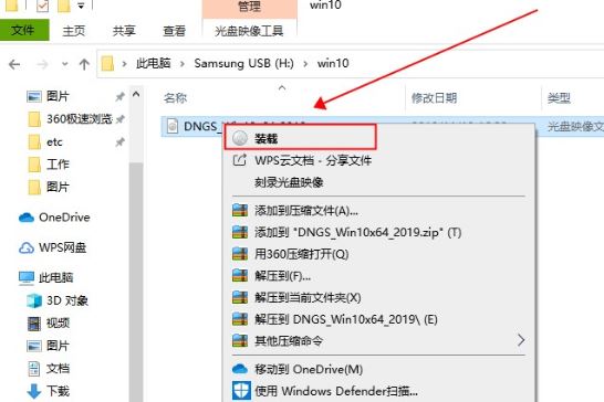 1.在文件夾中,找到你下載好的win10系統(tǒng),鼠標(biāo)右鍵該系統(tǒng)文件,選擇【裝載】。