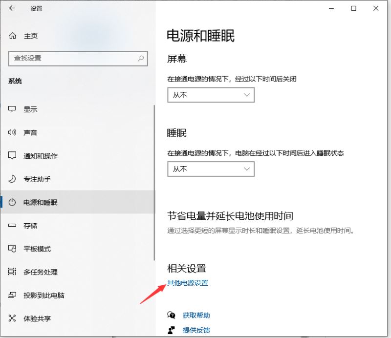 3、選擇電源與睡眠,然后點擊右側的其他電源設置。