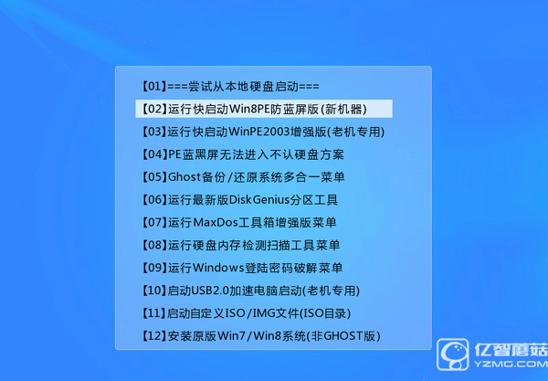 1、重啟電腦在開機的連續瞬間按下一鍵U盤啟動鍵進入快啟動主界面,用鍵盤上下鍵移動光標選擇“【02】運行快啟動Win8PE防藍屏版(新機器)”并回車確定,如下圖所示: