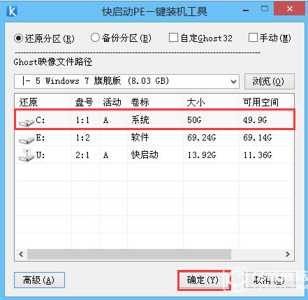 3、接著選擇我們要安裝的磁盤分區,默認情況下我們以C盤作為系統安裝的最佳分區選擇,然后點擊“確定”,如下圖所示: