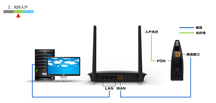 一、連接方法1、首先使用一根網線連接路由器的LAN與電腦的網口(如您電腦目前有網線連接著,請先拔出掉),連線如圖。2、接通斐訊路由器電源(除路由連接電腦的網線其余的網線暫時先不要接)3、接通路由...