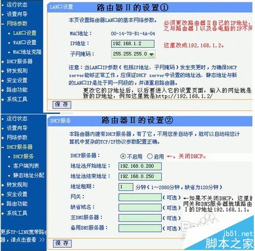 要點(diǎn):更改第二個路由器自己的IP地址,關(guān)閉它的DHCP。