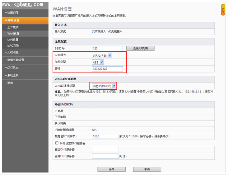 4、 點擊【連接】以后,【SSID號】會顯示所要連接的無線信號,【安全模式】、【加密類型】一般會自動的變成與上端設備一樣,只需要正確填寫上端無線信號的【密碼】?!網AN口連接類型】一般選擇【動態IP】即可,可根據需要選擇【靜態IP】,最后點擊【保存】。