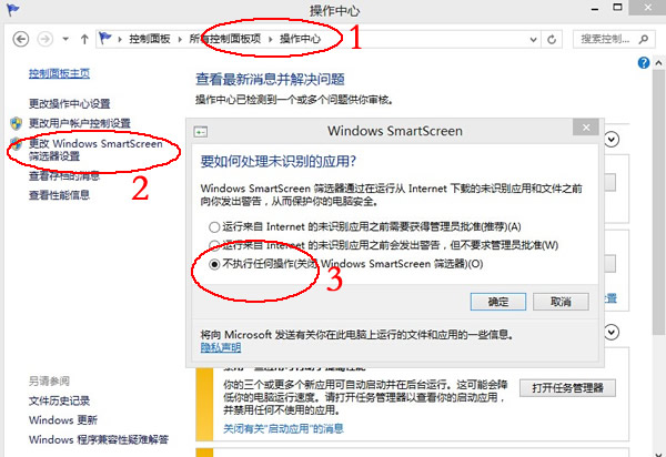 按Win+X組合鍵---控制面板---操作中心---更改Windows SmartScreen篩選器設置---不執行任何操作---確定。如下圖: