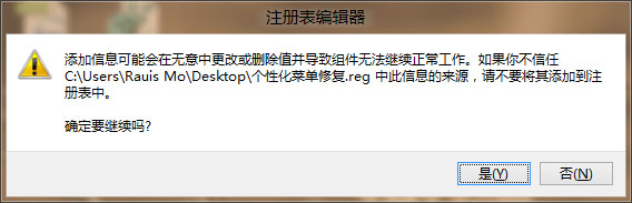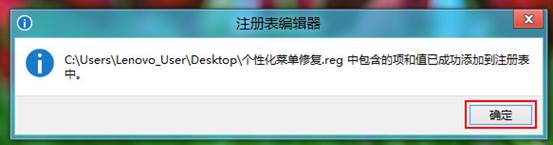 1、下載附件提供的“個(gè)性化菜單修復(fù).reg”至桌面,然后使用鼠標(biāo)左鍵雙擊運(yùn)行。如下圖所示: