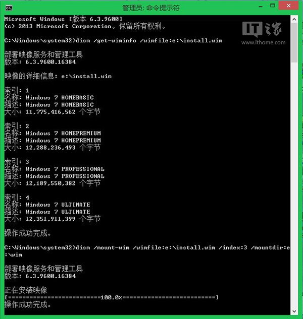 //掛載(Mount)映像中的”WINDOWS 7 PROFESSIONAL”的鏡像文件到e:wim文件夾中。(你可以更改index索引數值,例如選擇Ultimate旗艦版,即更改為index:4)