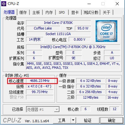 當然,如果是極限超頻愛好者,也可以在里面手動設置超頻頻率等,進一步挖掘CPU性能。超頻后,可以通過CPU-Z檢測i7 8700K主頻,看看是否超頻成功。