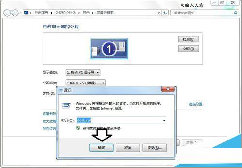 3、如果還能進操作系統,那就在運行中輸入:desk.cpl →確定,打開設置分辨率的設置項→返回適合當前顯示器的分辨率(通常是調低)。