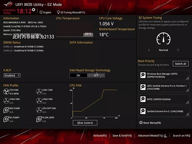當電腦主機開機的一瞬間,我們在鍵盤上按“DEL”鍵或者“Delete”鍵,反復(fù)按幾次,直到進入BIOS設(shè)置界面中,目前在BIOS識別的內(nèi)存頻率為2133MHz,我們按下F7鍵進入到高級模式設(shè)置。