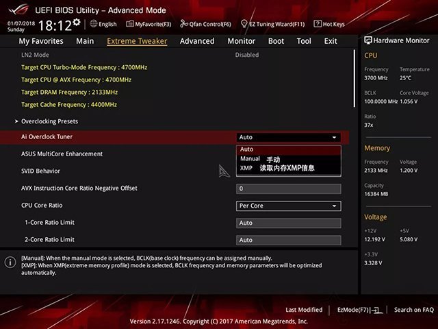 這時已經(jīng)進入了BIOS高級模式,在“Extreme Tweaker”選項卡中,進入超頻選項,選擇“ai overclock tuner”,出現(xiàn)三個選項,第一個為AUTO,第二個為手動,第三個則是我們即將選擇的XMP。