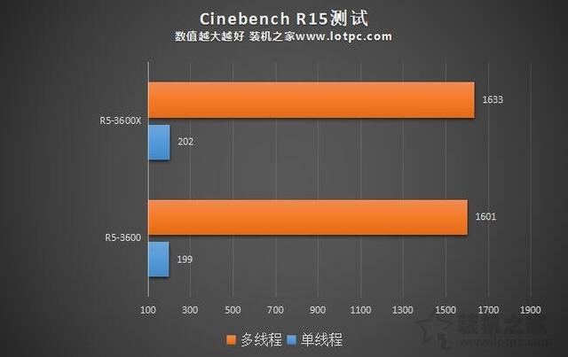 CineBench r15單線程測試結果中,R5 3600X獲得了202分,R5 3600獲得了199分,可以看出在單線程方面,基本相差無幾,而CineBench r15多線程測試結果中,R5 3600X獲得了1633分,R5 3600獲得了1601分,R5 3600X只領先了2%左右。