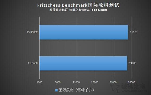 國際象棋跑分主要看步數, 每秒千步就是說CPU每秒能計算幾千步,這些步數越快說明CPU計算能力越強,性能越好。在國際象棋中,R5-3600X跑出了25063的成績,R5-3600跑出了24785的成績,差距并不是太大。