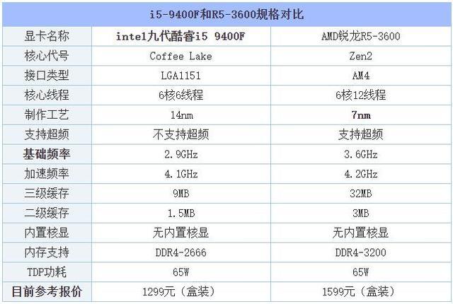 首先我們先來了解一下intel酷睿i5 9400F和AMD銳龍Ryzen5 3600參數對比情況,初步來了解一下兩款CPU的差異,如下。