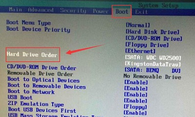 2、切換到boot選項,選擇“Hard Drive Order”,回車確認,如圖所示: