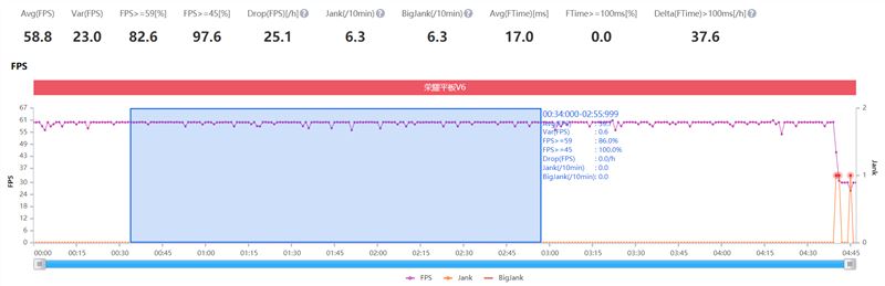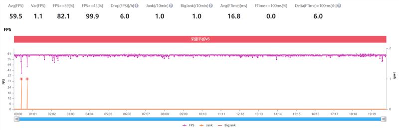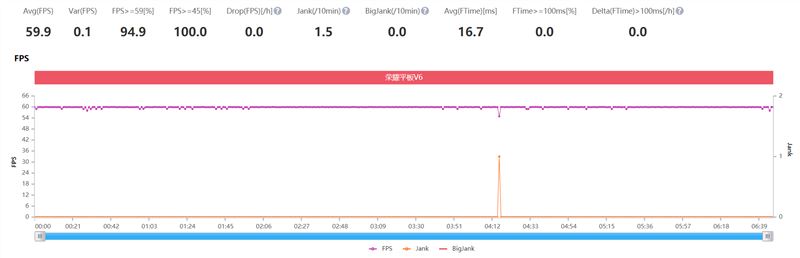 平均幀率為59.9FPS,F(xiàn)PS大于59的時(shí)間占游戲全程94.9%,全程發(fā)生卡頓僅有1次,無(wú)嚴(yán)重卡頓。
