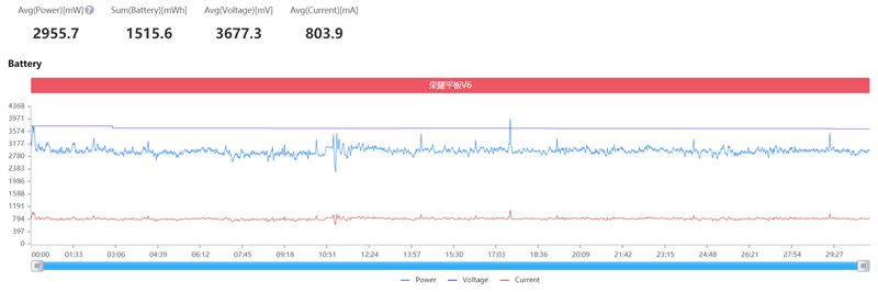 播放視頻30分鐘,掉電約6%,平均功耗2955.7mW,預(yù)計(jì)榮耀平板V6的視頻續(xù)航在9小時(shí)左右。