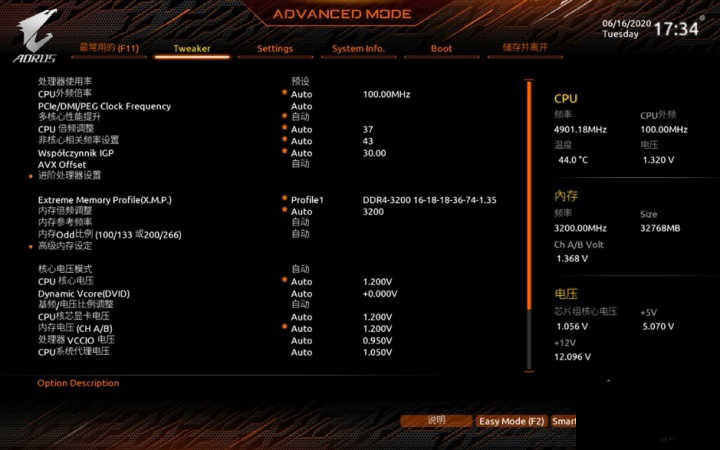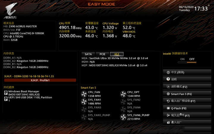 說到BISO,技嘉作為較早推行圖形化BIOS的廠商之一,旗下主板產(chǎn)品,尤其是中高端系列中,已經(jīng)全面采用了新的圖形界面。在Z490 AORUS MASTER中使用了新一代的簡易模式,在單一頁面顯示了包括CPU頻率、內(nèi)存信息、存儲設(shè)備等在內(nèi)的重要硬件信息,非常的直觀。