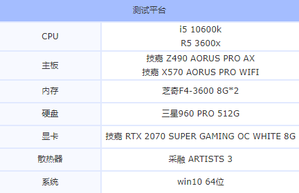 i5 10600k使用技嘉Z490 AROUS PRO AX主板,R5 3600X使用的是技嘉 X570 AORUS PRO WIFI主板,顯卡選用的是技嘉 RTX 2070 SUPER GAMING OC WHITE 8G,其它配件如下表所示。