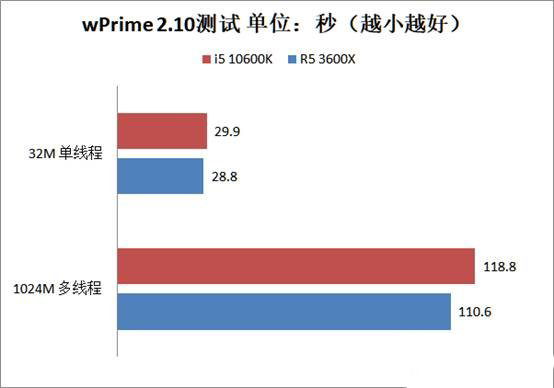 在wPrime 2.10測試中,R5 3600X的單核及多核性能都要比i5 10600k表現更好,這個結果和之前的SuperPi測試出現了反差,其原因應該是wPrime的算法和SuperPi不一樣導致的。