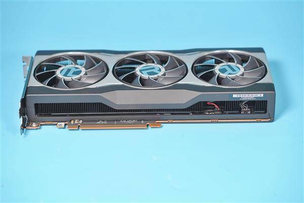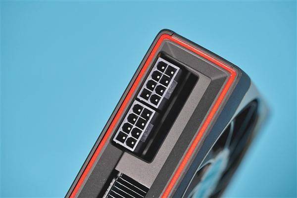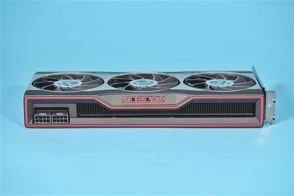 AMD RX 6800正面采用一體感極強,前后鋁合金外殼。同樣三個風扇設計,同樣雙8Pin供電接口,不過頂部Logo取消了發光設計,換成了更加醒目的紅色。