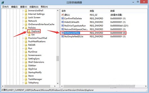 2、在注冊(cè)表編輯器界面中,我們依次展開“HKEY_CURRENT_USER\Software\Microsoft\Windows\CurrentVersion\Policies\Explorer”,單擊選中“Explorer”,在窗口右邊找到“NoRecycleFiles”,如下圖所示: