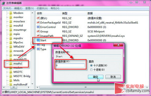 依次展開HKEY_LOCAL_MACHINESystemCurrentControlSetServicesMsahci項目,雙擊右邊窗口的“Start”名稱,看到“數據數值”默認為“3”,將其改為“0”后,點擊“確定”按鈕退出(圖2)。