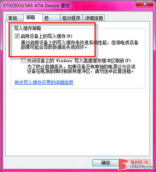 方法是進入設備管理器,展開“磁盤驅動器”,右鍵單擊硬盤標志,并選擇“屬性”(圖5),切換到“策略”窗口,勾尋啟用設備上的寫入緩存”(圖6),然后點“確定”按鈕。