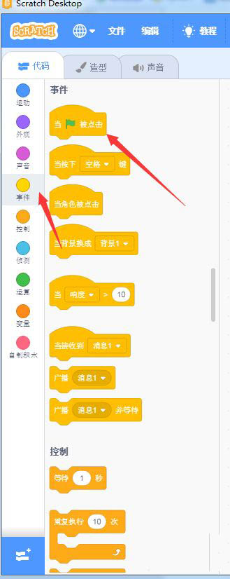 點擊。為衣服角色設計代碼。拖事件之點擊綠旗進代碼區,