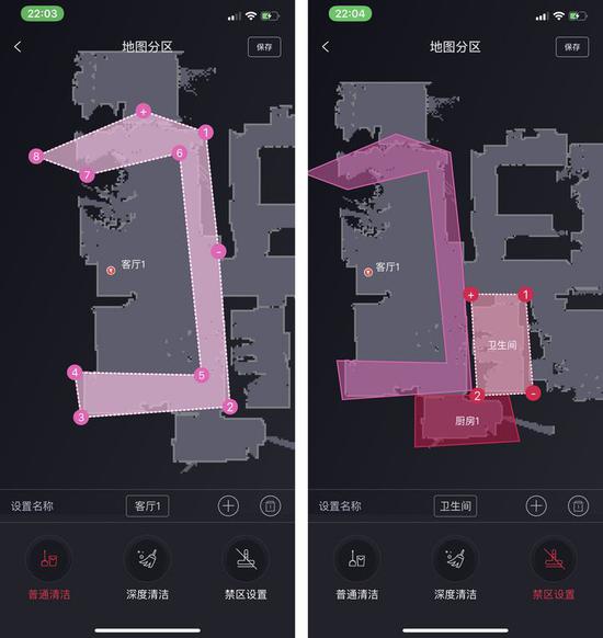打個比方,這幾天我就在手機端將一些積灰較多的墻角劃分為好幾個小區域,由于支持 10 點自定義,所以可以只畫沿墻的部分而不用覆蓋其它區域,至于像衛生間和陽臺等則可以設為禁區,這樣就算是沒人在家忘了關戶內門,也不用擔心 R55 Cyclone 進入是非之地了。