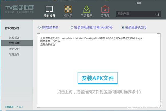 七、選擇“應用安裝”,將當貝桌面的文件拖入框中進行安裝;