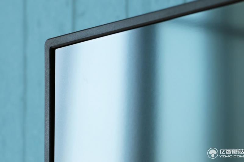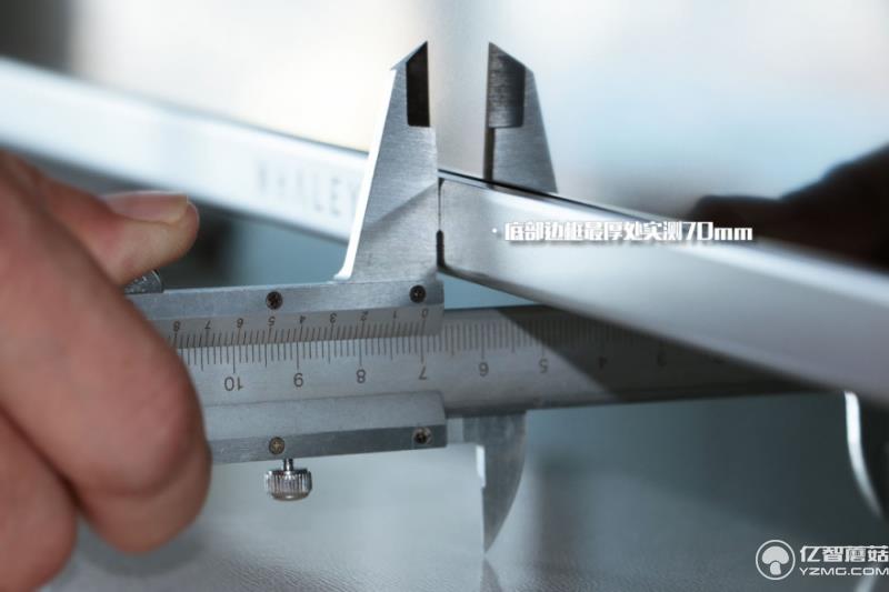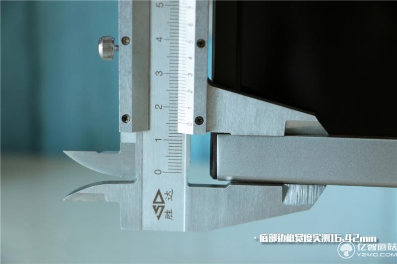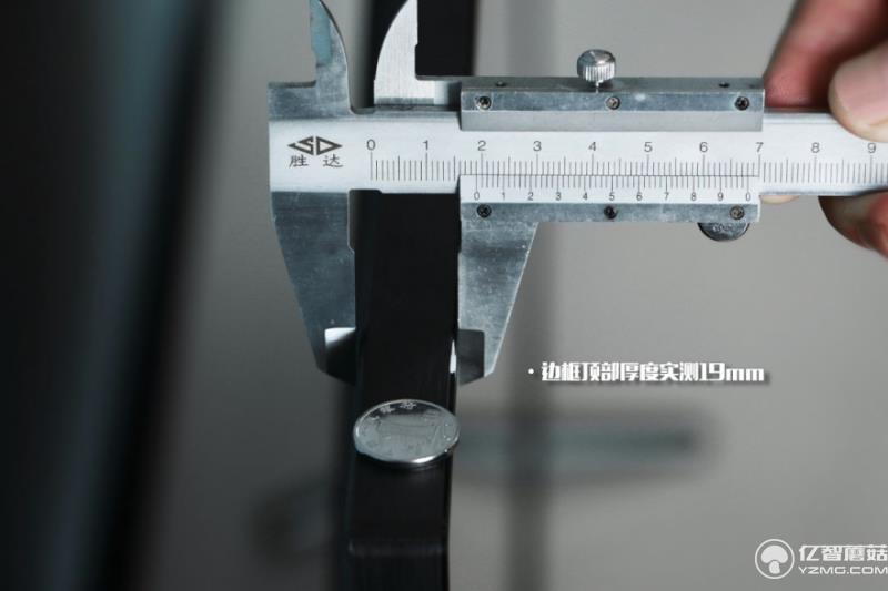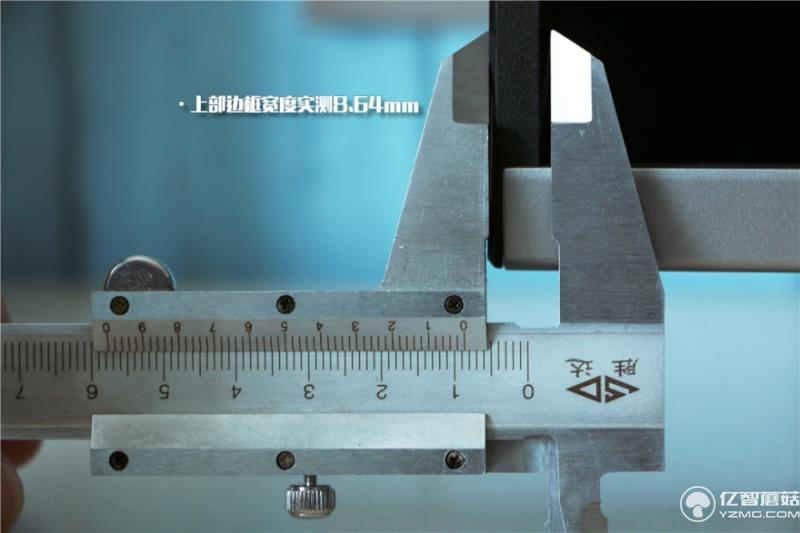 從實測來看,頂部邊框的厚度為19mm,因為采用了倒角處理,看起來要更薄一點,外框寬度8.64mm,也屬于是比較窄的。
