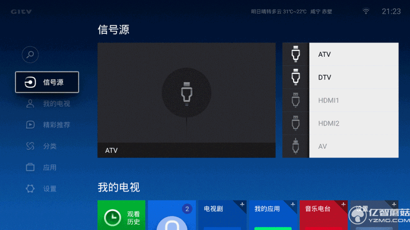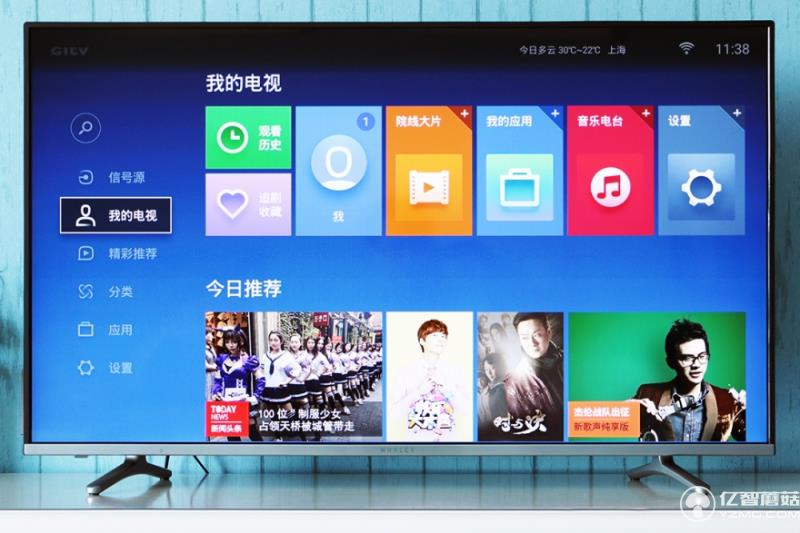 WUI界面采用瀑布流設計,與很多普通的扁平化電視UI略有不同,其功能區塊分為信號源、我的電視、經擦推薦、分類、應用和設置6個大項,操作效率更高,而豎向移動的方式更符合大屏電視的操作習慣。