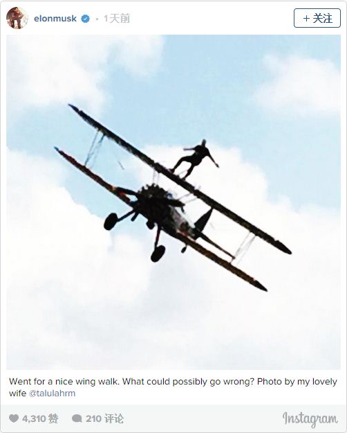 馬斯克在Instagram上發布的機翼行走照片鳳凰科技訊北京時間8月10日消息,據科技網站Mashable報道,周末怎么過?漂流?太不刺激了。攀巖?開玩笑...