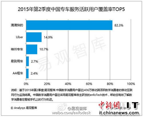 易觀國(guó)際本次發(fā)布的數(shù)據(jù)顯示,在絕對(duì)數(shù)量上,滴滴快的以覆蓋以110個(gè)城市位列專(zhuān)車(chē)服務(wù)覆蓋城市數(shù)首名,并以82.3%的比例占據(jù)中國(guó)專(zhuān)車(chē)服務(wù)活躍用戶(hù)覆蓋率的第一名。同時(shí),易觀國(guó)際本次公布的數(shù)據(jù)中,滴滴快的用戶(hù)的質(zhì)量和未來(lái)發(fā)展?jié)摿?,也處于絕對(duì)領(lǐng)先的地位。