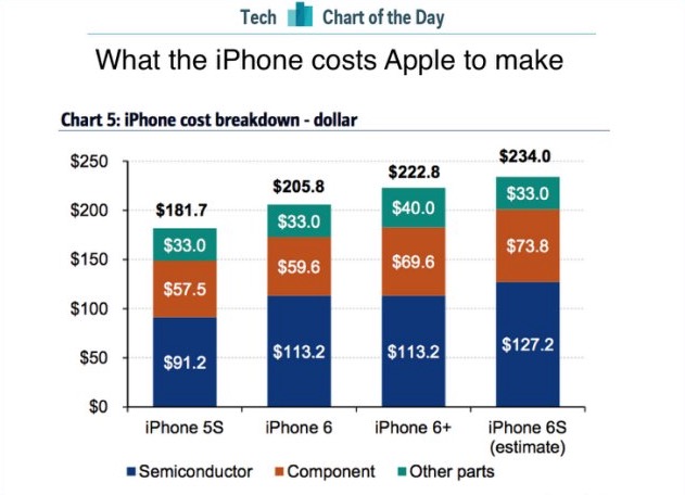 北京時間9月12日消息,美銀美林周五發(fā)布報告稱,以存儲空間為64GB的機(jī)型為例,iPhone 6s的組件成本大約為234美元。