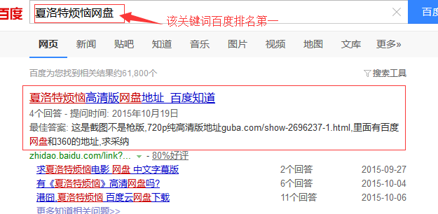 由于百度對于自家產(chǎn)品給予的排名相對較高我們除了在論壇貼吧引流外還選擇了百度知道這一平臺。而在知道中我們的標題用:xxx網(wǎng)盤地址、xxx 高清網(wǎng)盤地址、xxx下載鏈接、求xxxx網(wǎng)盤等等帶上“求”、“網(wǎng)盤”、“鏈接”這樣的詞匯更加符合用戶的搜索習慣,這樣的關(guān)鍵詞放在標題中當用戶搜索 相關(guān)關(guān)鍵詞之后更容易出現(xiàn)在搜索結(jié)果中。如圖我這“夏洛特煩惱高清版網(wǎng)盤地址”已經(jīng)是“夏洛特煩惱網(wǎng)盤”、“夏洛特煩惱高清網(wǎng)盤地址”等關(guān)鍵詞搜索結(jié)果的 第一位。