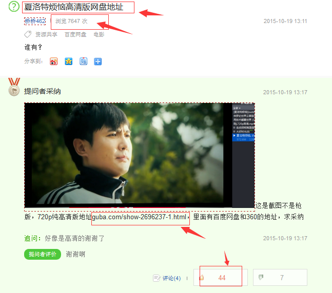 接下來我們就需要找朋友點贊,當問答有十幾個贊的時候,就基本上已經(jīng)被收錄了,此時我們就可以去一些知道互贊,互答等qq群推廣推廣,當由用戶通過 這個知道到達我的網(wǎng)站帖子獲得他想要的結(jié)果,有的是會回來點贊的就像這個知道40多個贊基本都是普通用戶點的而不是刷的,在這種狀態(tài)下這個知道就更容易被 百度推薦并出現(xiàn)在搜索結(jié)果中獲得好的排名。慢慢地陷入一個良性循環(huán),在這期間我們還需要經(jīng)常去我們網(wǎng)站的帖子看網(wǎng)盤有沒有失效等等,只有真實有效的分享才 能獲得用戶的認可。這條知道直到目前已經(jīng)帶來了數(shù)萬流量雖然顯示的只有7647條閱讀,但這里的統(tǒng)計有缺失,并非那么的精準。