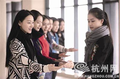 來自傳媒學(xué)院的志愿者正在進(jìn)行禮儀培訓(xùn)。 通訊員 沈志成 攝