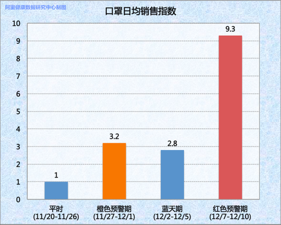 從數據圖可以看出,在11月27日至12月1日的橙色預警期間,口罩銷售情況有了明顯增加;而在12月7日至12月10日的紅色預警期間,口罩的銷量大幅攀升,并于12月9日達到高峰,總體為平時銷售量的9.3倍、橙色預警期間銷量的近3倍。
