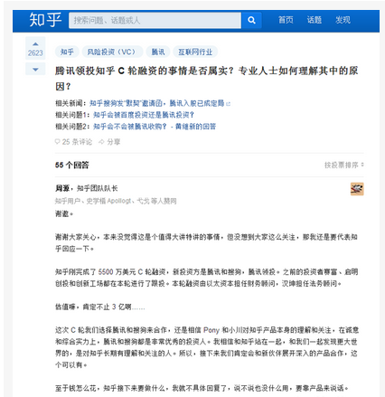2015年11月,知乎創始人周源披露:“知乎完成了5500萬美元C輪融資,新投資方是騰訊和搜狗,騰訊領投。之前的投資者賽富、啟明創投和創新工場都在本輪進行了跟投。本輪融資由以太資本擔任財務顧問。這次C輪我們選擇騰訊和搜狗來合作,相信和知乎一起發現更大的世界。”