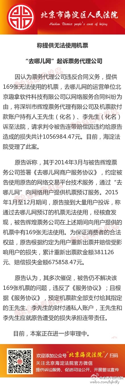 去哪兒網起訴票務代理公司 稱提供無法使用機票