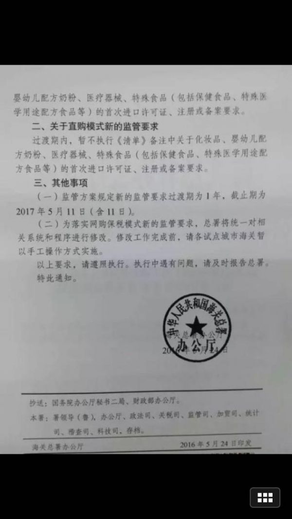 新浪科技訊5月25日下午消息,海關總署昨日發布了關于執行跨境電商電子商務零售進口新的監管要求通知,通知稱“過渡期間,在試點城市繼續按稅收新政實...