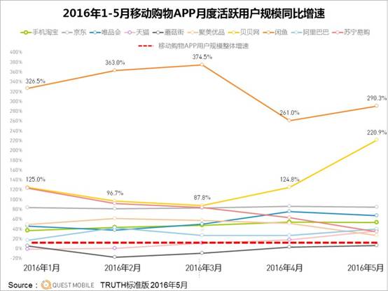 貝貝網的月度活躍用戶規模同比增速的表現同樣驚人,2016年5月份已經飆漲至220.9%。